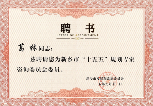 此次葛林博士获评新乡市“十五五”规划专家咨询委员会委员并主讲市直机关能力素质提升课,是地方政府对我校教学科研实力与人才培养质量的充分认可。太阳集团tcy8722将持续发挥学科与人才优势,鼓励教师深度参与地方经济社会发展实践,为新乡推进高质量发展、实现“十五五”时期战略目标贡献更多新院力量。